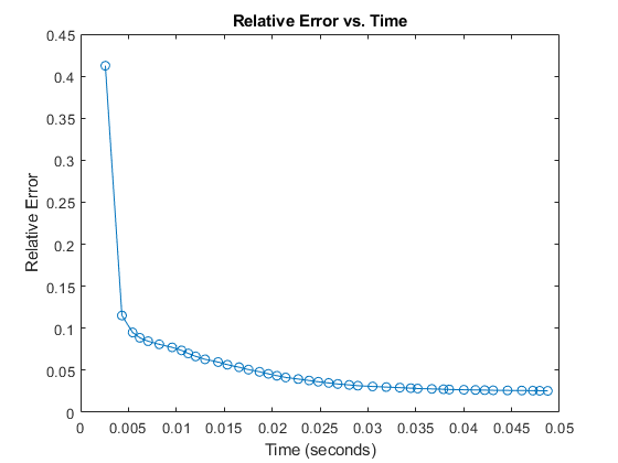 rng('default') % Reproducibility [M6, ~, output6] = cp_als(X,3,'init','nvecs','trace',true,'printitn',10); figure(3); clf; plot(output6.time_trace, 1-output6.fit_trace,'-o'); title('Relative Error vs. Time'); xlabel('Time (seconds)'); ylabel('Relative Error');