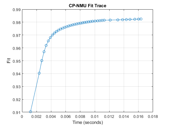 rng('default') % For reproducibility [M, ~, out] = cp_nmu(X, R, 'trace', true, 'maxiters', 50); score_val = score(M, M_true); fprintf('Score (run with default options): %.4f\n', score_val); figure(1); clf; plot(out.time_trace, out.fit_trace, '-o'); xlabel('Time (seconds)'); ylabel('Fit'); title('CP-NMU Fit Trace'); grid on;